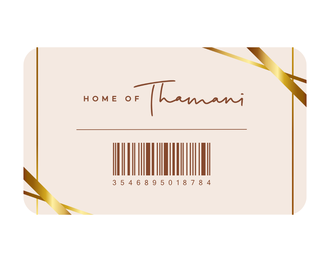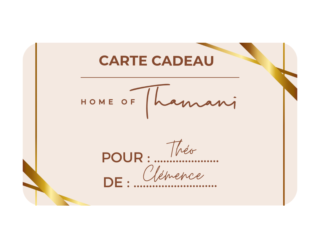 Envoyée instantanément par e-mail, la carte cadeau Home of Thamani est simple à utiliser et valable sur tous les produits du site home-of-thamani.com.