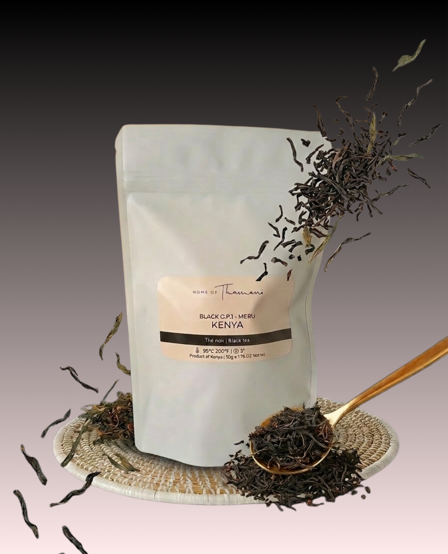 Grown in Meru County on the slopes of Mount Kenya, this tea comes from high-altitude plantations where the temperate climate and volcanic soil support exceptional quality. These unique conditions give this black tea its aromatic depth and vibrant color.