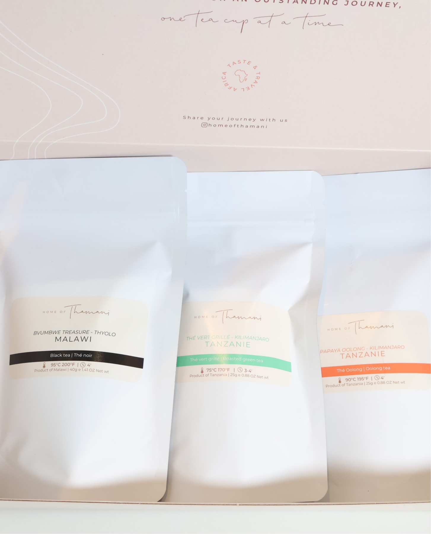 Discover the exceptional world of Grands Crus with our curated gift box, featuring three exclusive teas from Home of Thamani. This collection offers a refined selection for discerning tea lovers, Perfect for gifting or elevating your own tea moments, this set showcases the finest in African tea craftsmanship.